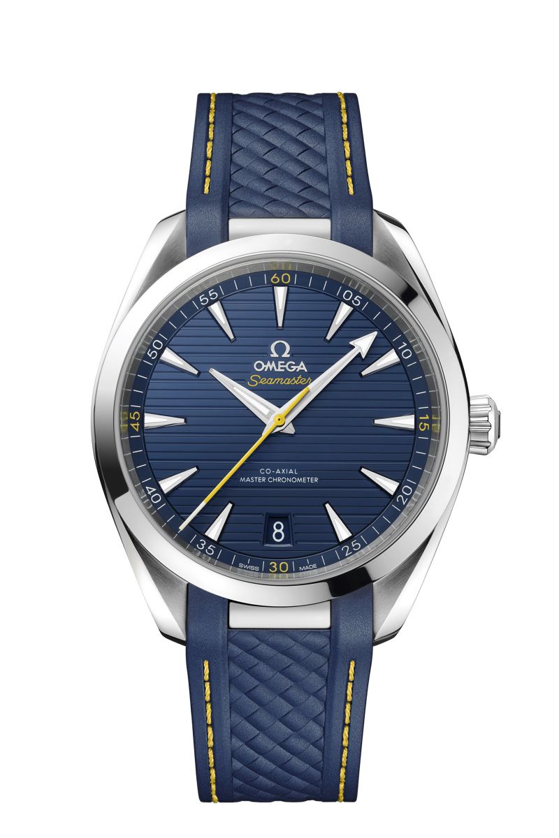 在錶盤上,歐米茄對標誌性的 Aqua Terra 風格進行了微妙的改變。雖然藍色表面採用了傳統的似蛋白石的水平條紋飾面,但獨特致敬 Mondo 的元素包括黃色的’Seamaster’和刻鐘數字。最顯著的是,中央秒針也為黃色,設計靈感來自撐竿跳高,頂端塗有 Super-LumiNova 夜光塗料,以代表使用的撐竿。