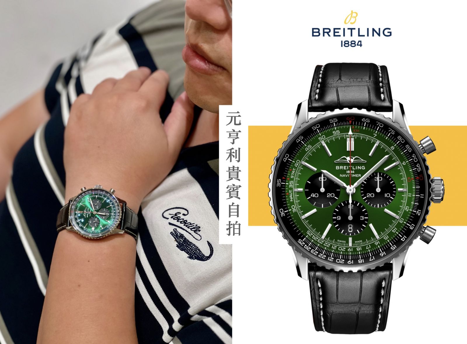 當這位品味獨到的貴賓因為朋友配戴的百年靈而瞬間「被燒到」,決定親自來店賞錶時,命運的邂逅就此展開。他在展櫃中發現了屬於自己的那一只——Breitling Navitimer 賓利綠。