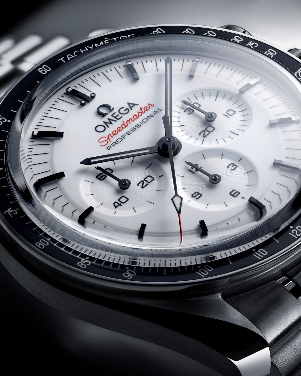 當最初超霸腕錶於 1957 年問世時,設計師主要目標之一即是打造一款極佳易讀的顯示界面。因此,採用了黑色錶盤上的白色指針和與時標。在這個新版本中,相反的配色達到相同效果。歐米茄不僅採用帶有黑色細節和全新鑲貼時標的白色錶盤,並於超霸名稱”Speedmatser”添加了醒目的紅色點綴,設計師還首次在專業登月錶錶盤上添加了引人注目的亮漆飾面。